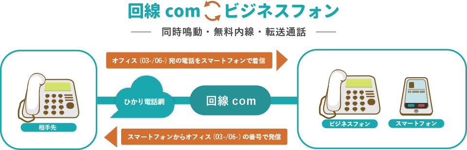 回線COMとはお手持ちのスマホを内線化で持ち運びできるので、ビジネスフォンがポケットに入っているように「03」「06」「0120」、「外出先」「海外」どこでもインターネット環境があれば発信・着信・内線通話をご利用できます。